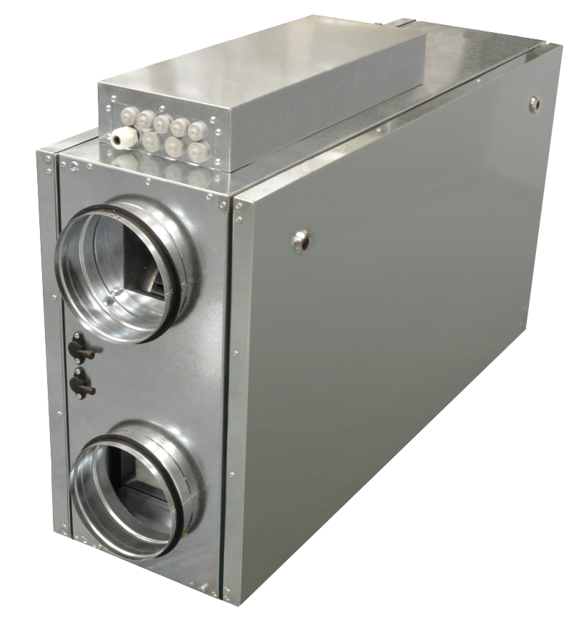 Установки с рекуперацией тепла очищают, нагревают и подают свежий воздух. Установки извлекают тепло у вытяжного воздуха и передают его поступающему воздуху. Эффективность рекуперации 55-75%. Имеется защита от замерзания. Установки используются только в системах вентиляции.
